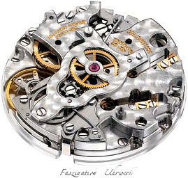 Zeigerstellung durch Ziehen der Krone • 4 Hämmer auf 4 Tonfeder (Kathedralfeder) • Konstante Kraft • Unruh- sowie Ankerradkloben mit Incabloc-Stoß- sicherung • 516 Einzelteile |