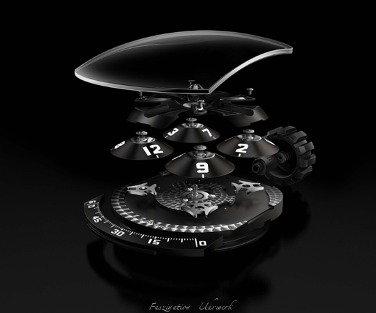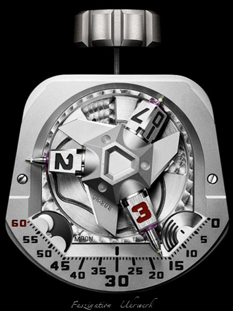 UR 7.02 ? mm (?"') ? mm 34 28.800 A/h (4 Hz) 39 Std. Automatik • Schweizer Anker • Flach-Spirale • Glucydur-Unruh, 2-schenklig URWERK SA 2008 ? Formwerk • Brücken aus ARCAP P40 Legierung; Bronze-Beryllium; Titan • Stunde in Würfelform • Minute durch Teleskop • Tag- / Nachtanzeige • Öl-Anzeige "Oil change" • Mondphase • Zeigerstellung durch Ziehen der Krone auf "12" • Automatik mit Steuersystem "Turbine Automatic" (rückwärtiger Wahlschalter für drei verschiedene Aufzugsarten) • Planetengetriebe • Stellschraube für die Stunde (Rückseite) • Stoßsicherung • Alle Brücken und Kloben angliert • Perlierte Grundplatine Die Uhrzeit wird anhand von drei sich drehenden Stundenwürfeln angegeben, die jeweils von einem teleskopischen Minutenzeiger durchbohrt sind. Dieser Zeiger folgt exakt den Linien der drei Minutensegmente: 0-14, 15-44 und 45-60. Ist der Teleskopzeiger ausgefahren, kann die Uhrzeit bequem abgelesen werden; ist er hingegen eingefahren, stellt er die Rotation der zentralen Satelliten- Komplikation sicher. Werksplatine und Stundenwürfel sind aus einer ARCAP P40-Legierung, die Transporteure aus Berylliumbronze mit MOVIC-Behandlung sowie die Teleskop- zeiger aus Titan. ARCAP ist eine patentgeschützte Legierung ohne Eisengehalt = anti- magnetisch. |