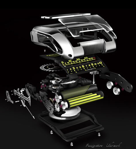 UR 9.01 ? mm (?"') ? mm 46 28.800 A/h (4 Hz) 39 Std. Automatik • Schweizer Anker • Flach-Spirale • Glucydur-Unruh, 2-schenklig URWERK SA 2011 ? Formwerk • Brücken aus ARCAP P40 Legierung; Bronze-Beryllium; Aluminium • Stunde mittels Aluminium-Würfel • Minute • Kleine Sekunde (Werkseite) • Tag- / Nachtanzeige (Werkseite) • Öl-Wartung "Oil change" (Werkseite) • Zeigerstellung durch Ziehen der Krone • Automatik (über Doppelturbine regulierter einseitiger Rotor) • Planetengetriebe • Stoßsicherung • Alle Brücken und Kloben angliert • Perlierte Grundplatine Die drei beweglichen Stundenmodule – wovon jedes aus einem Stunden- satelliten mit Minutenzeiger besteht – sind je auf einem Planetengetriebe fixiert, führen eine ständige Gegendrehung aus und gleichen somit die Kreisbewegung des zentralen Karussells aus. ARCAP ist eine patentgeschützte Legierung ohne Eisengehalt = anti- magnetisch. |