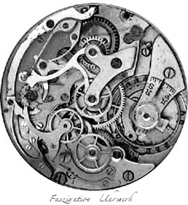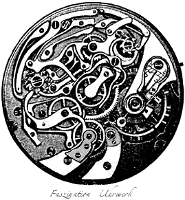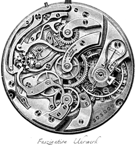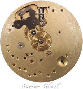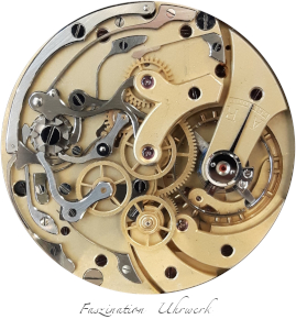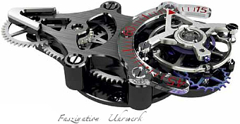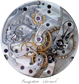 UR 3.03 / UR 3.04 ? mm (?"') ? mm ? 21.600 A/h (3 Hz) 43 Std. (UR 3.03) / 36 Std. (UR 3.04) Handaufzug • Schweizer Anker • Flach-Spirale • Glucydur-Unruh, 2-schenklig, Masseschrauben URWERK SA 2009 ? Formwerk • Brücken aus ARCAP P40 Legierung; Bronze-Beryllium • Stunde mittels konischen Aluminium-Scheiben • Minute mittels konischen Aluminium-Scheiben • Kleine Sekunde (Rückseite) • 15-Minuten Register (Rückseite) • Gangreserve (Rückseite) • Zeigerstellung durch Ziehen der Krone • Stellschraube für die Stunde (Rückseite) • Stoßsicherung • Alle Brücken und Kloben angliert • Perlierte Grundplatine URWERK wurde 1995 von den Uhrmacherbrüdern Felix und Thomas Baumgartner sowie ihrem Freund Martin Frei, einem Künstler und Designer gegründet. Ihre erste Uhr war von einer Nachtuhr aus dem 17.Jahrhundert von den Gebrüdern COMPANUS inspiriert, die ro- tierende Scheiben zur Stundenanzeige benutzte. Zeitanzeige mittels 4 konischen Aluminium-Scheiben, welche an einer Drehbrücke hängend durch Malteserkreuze aus Bronze-Beryllium gesteuert werden. Auf der Rückseite befindet sich das Kontrollboard mit Gangreserveanzeige, Regelanzeige 15 Minuten und Sekunden sowie Stellschraube für die Stunde. ARCAP ist eine patentgeschützte Legierung ohne Eisengehalt = anti- magnetisch. |