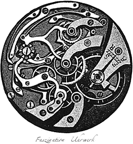 216 19"' 17-19 18.000 A/h (2.5 Hz) 32 Std. Kronenaufzug • Schweizer Anker, Échappement à ligne droit • Breguet-Spirale, gebläut • Bimetallische Schrauben-Unruh, 2 schenklig Ulysse Nardin SA 1920er ? Chronograph mit Schaltrad-Steuerung; Lépine • Uhren-Messing, rhodiniert / vergoldet • Stunde • Minute • Zentraler Chronographen-Zeiger • 60-Sekunden Register auf "6" • 30-Minuten Register auf "12" • Zeigerstellung durch Ziehen der Krone • Chrono-Funktion durch seitlichen Drücker • Federhaus mit Malteserkreuz-Stellung • Beweglicher Spiralklötzchenträger, geklemmt und ver- schraubt • Feinregulierung • Deckstein • Alle Brücken und Kloben angliert • Alle Stahlteile angliert und matt gebürstet • Perlierte Grundplatine • Grainierte Werksoberflächen (Versionsabhängig) • Genfer Streifenschliff (Versionsabhängig) |