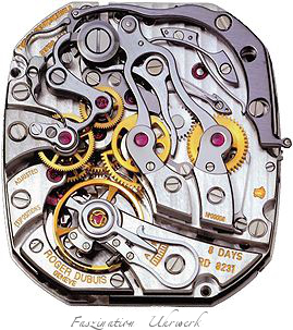 RD8231 30.45 mm (13½"') 7.60 mm 28 21.600 A/h (3 Hz) 192 Std. / 8 Tage Handaufzug • Schweizer Anker • Flach-Spirale • Glucydur-Unruh, 3-schenklig Manufacture Roger Dubuis SA (Richemont) Roger Dubuis Kaliber RD82 2001 ? Formwerk; Chronograph mit Schaltrad-Steuerung • Uhren-Messing, rhodiniert • Stunde • Minute • Zentrale Chrono-Sekunde • 30 Minuten-Register auf "3" • Kleine Sekunde auf "9" • Zeigerstellung durch Ziehen der Krone • Mono-Drücker (alle Funktionen über die Krone) • Chronobrücke mit 2 verschraubten Deckstein-Plättchen • Schwanenhals-Feinregulierung • Beweglicher Spiralklötzchenträger • KiF-Stoßsicherung • Alle Brücken und Kloben angliert • Alle Stahlteile angliert und poliert • Perlierte Grundplatine • Genfer Streifenschliff • Genfer Siegel Entwicklung der Firmengeschichte: Sogem SA (Société Genevoise des Montres) ---> Manufacture Roger Dubuis SA |