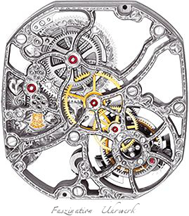 Krone • Antrieb mit konstanter Kraft "constant force" für 1 Minute, Patent EP1528443 • Feinregulierung ohne Rückersystem durch Veränderung des Trägheitsmoments am Unruhreif • Hemmungsrad mit 15 Zähnen • Beweglicher Spiralklötzchenträger • Incabloc-Stoßsicherung • 234 Einzelteile |